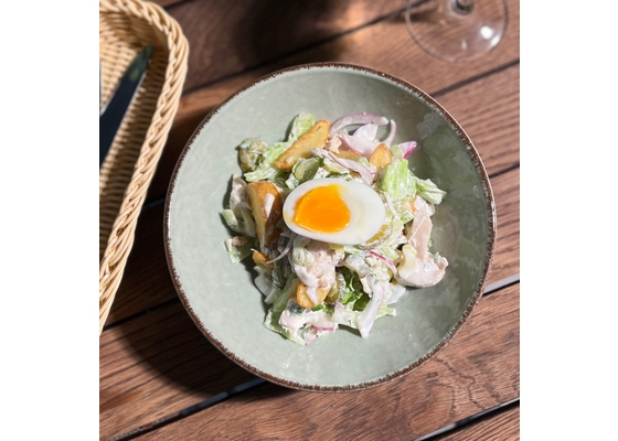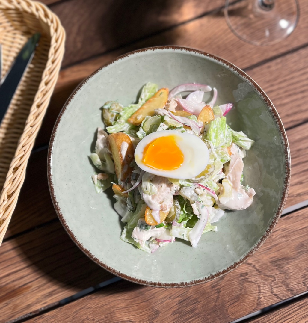 Дольки ожаренные, отварное филе куриное, яйцо, стебель сельдерея, корнишоны, красный лук, соус ранч
